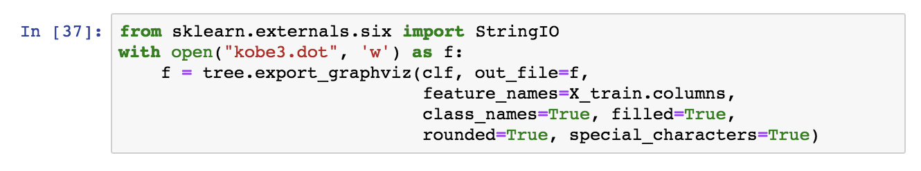 - I will plot the predicted areas with a contour: In the blue areas, the tree predicts that shot will fail, while in the yellow ones that the shot will go in.