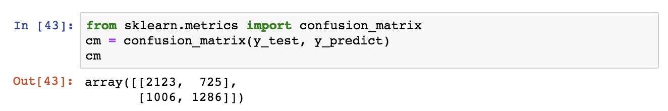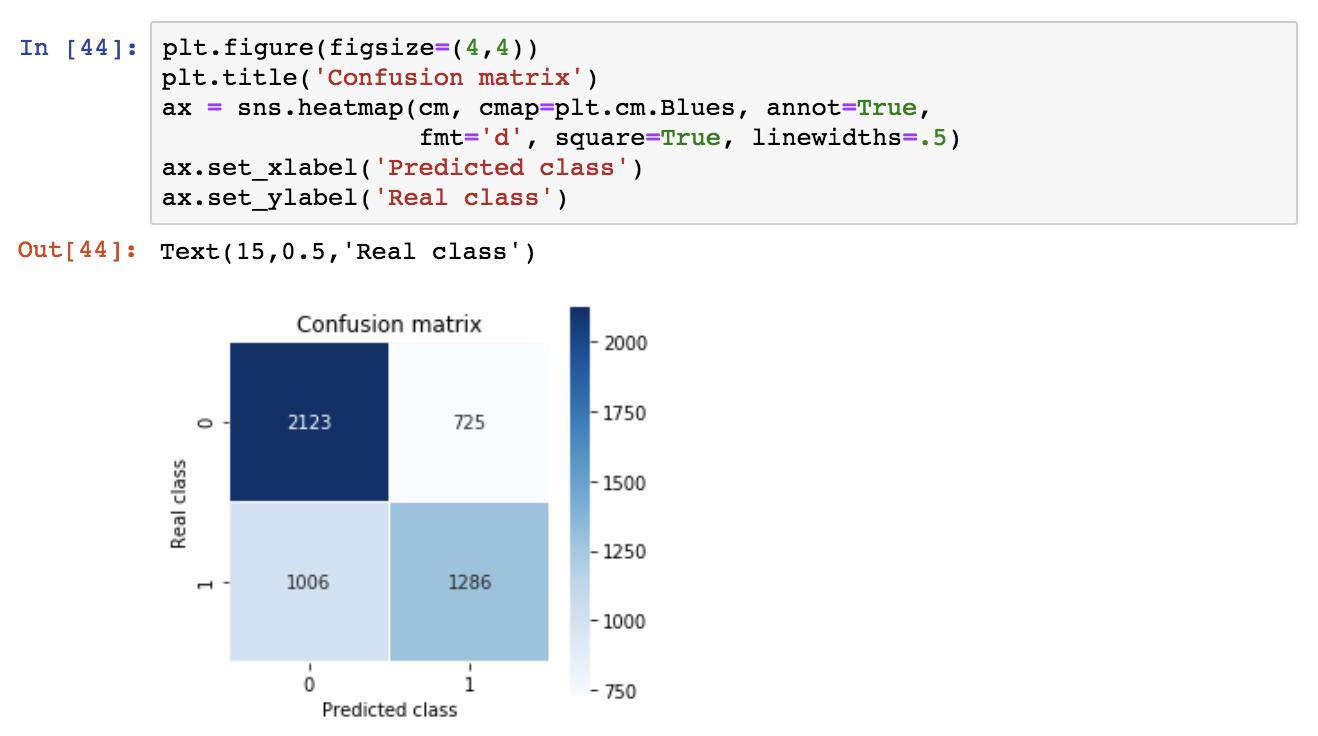 The y-axis is the real class, the x-axis is the predicted class and classes appear in ranked order (so 0, 1). According to this, we get a high number of false negatives (1006). For transparency, we can plot the confusion matrix.