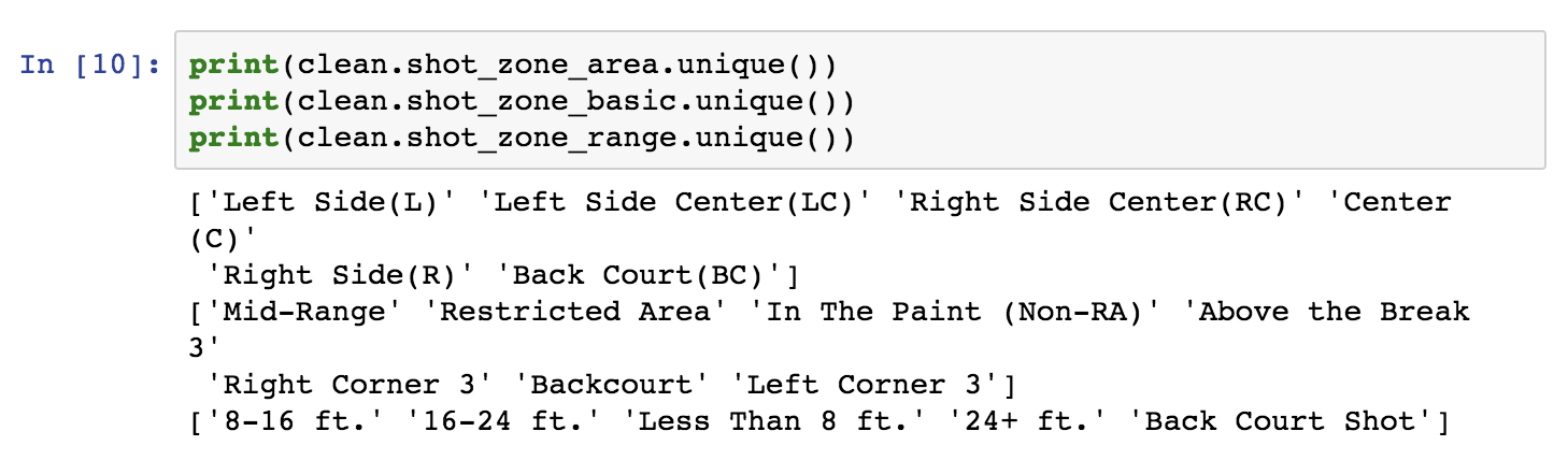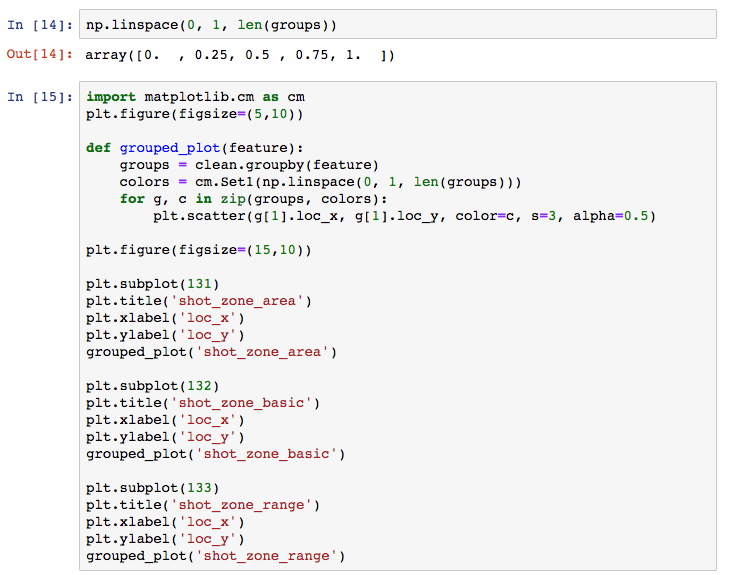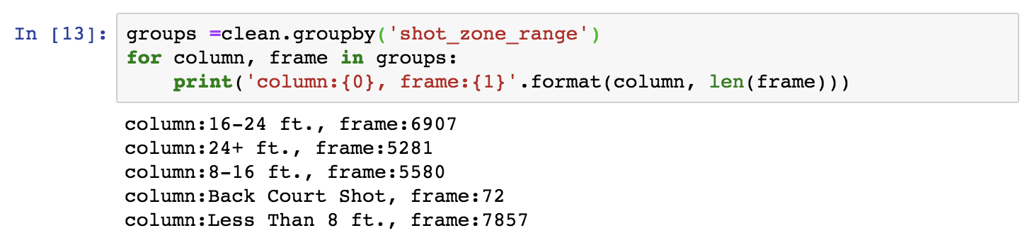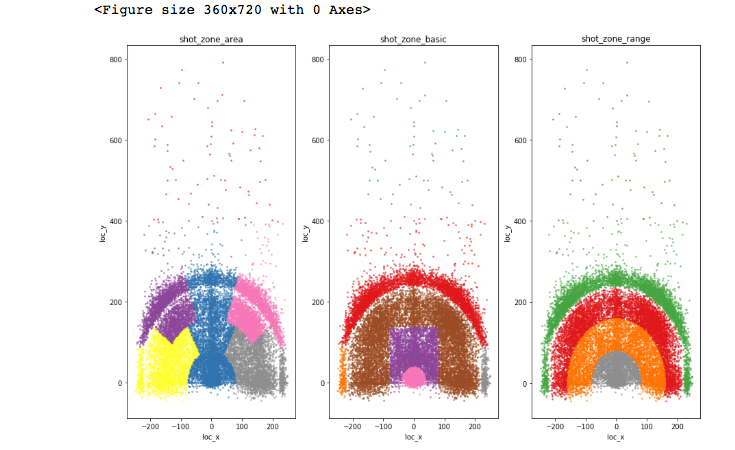 I will next check whether the area-related fields signify different areas of the court, related to the coordinates and I will map them. To this aim I will use the Pandas groupby utility. I will do it step-by-step for clarity. So let’s first deepdive a bit into groupby dataframes and how they can be used, before actually using them for further visualisation. Let’s group by shot_zone_area. We can then iterate on the groupby dataframe by the column we used to group items on and the rest of the dataframe, as shown next. The following block will show us the different values of the column we grouped by, and the length of each corresponding division in the rest of the dataframe.
