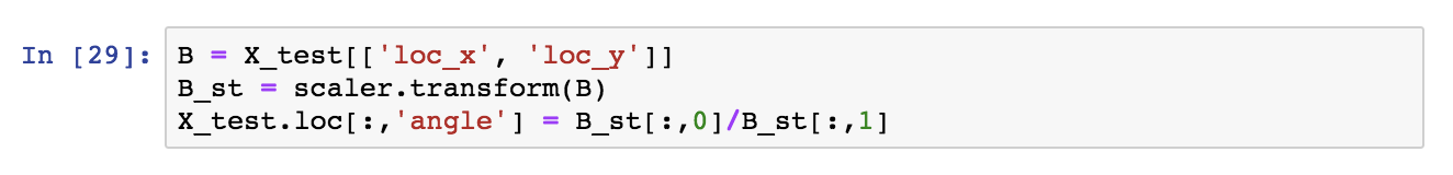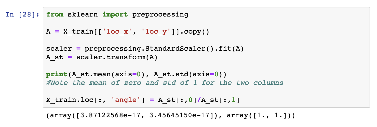 For the purposes of creating an angle feature though we will standarise loc_x and loc_y, to avoid zero values that may result in divisions by zero. With standarisation, the data are re-distributed around a mean of zero in one standard deviation distance.
