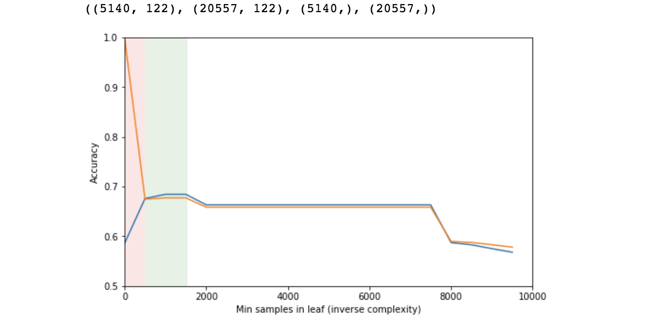 - At some point, the two lines converge and the sweetspot seems to be in the area of 500 to 1500 samples in each leaf (green area).