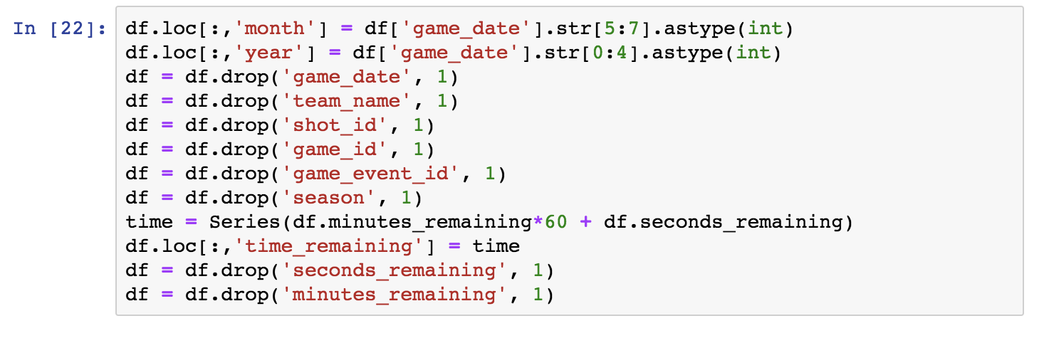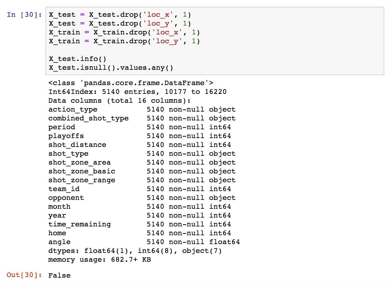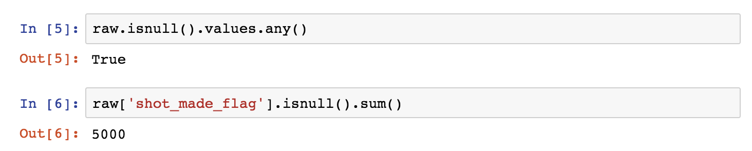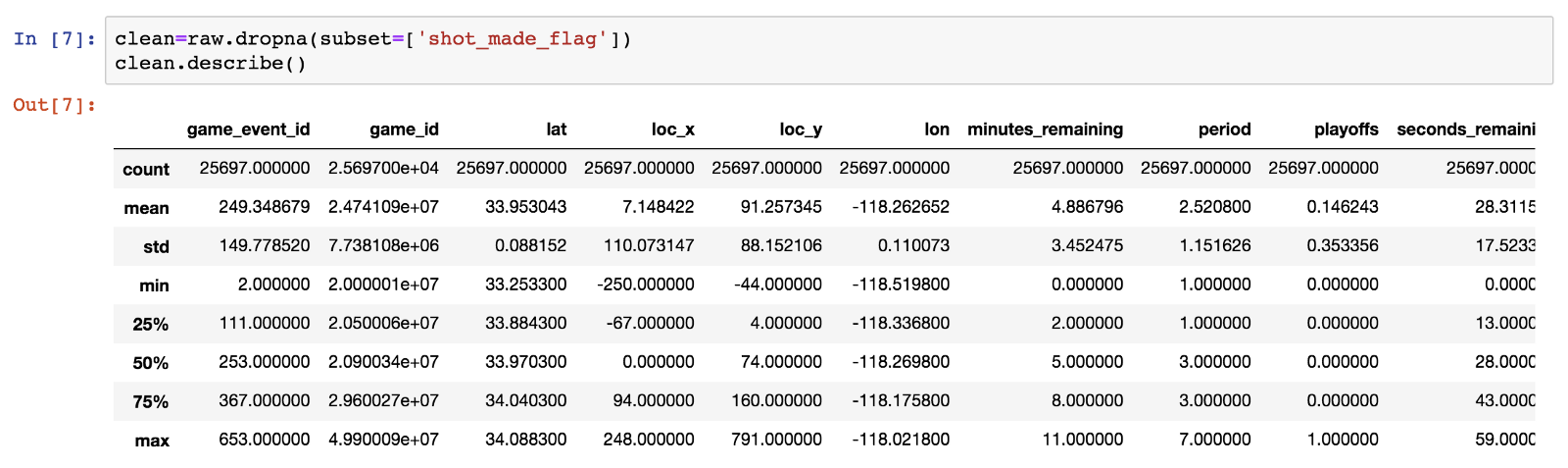 Next, let’s drop the rows in which shot_made_flag has null values, as they are not useful for either training or testing. We will use a new dataframe for the cleansed data.