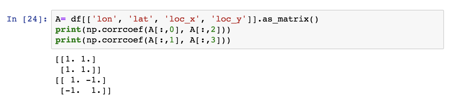 Now, there is a question pending from earlier on: Why do we have loc_x, loc_y and lon, lat in the dataset? Let’s check whether they are redundant, “mirrored” data as we assumed in previous steps. A simple way to do this, is to compute the correlations between the variables loc_x and lon, and loc_y and lat respectively.