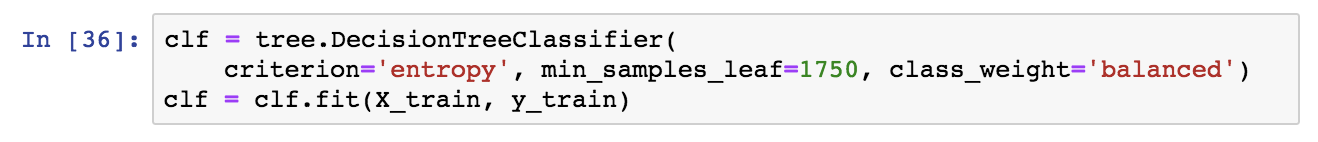 - I will train a tree classifier for various model complexities like before (more particularly minimum 250–1750 samples at each leaf), only this time with these two features only.