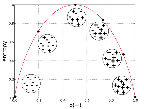 Decision trees work by splitting the sample space into purer segments. The criterion that we will use for splitting is entropy (although you can also use gini). Entropy is defined as follows: