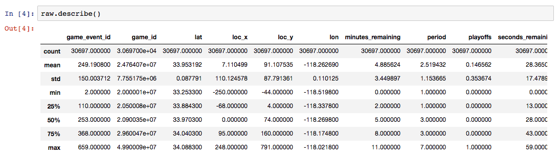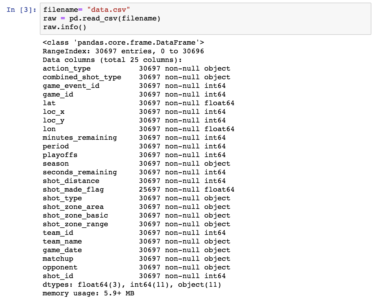 The first step is to explore the dataset at hand. This file is provided by Kaggle: data.csv. We only know that theshot_made_flag field is the target variable: Its value is 1 if Bryant scored that shot and 0 if he failed it. Everything else remains to be investigated.