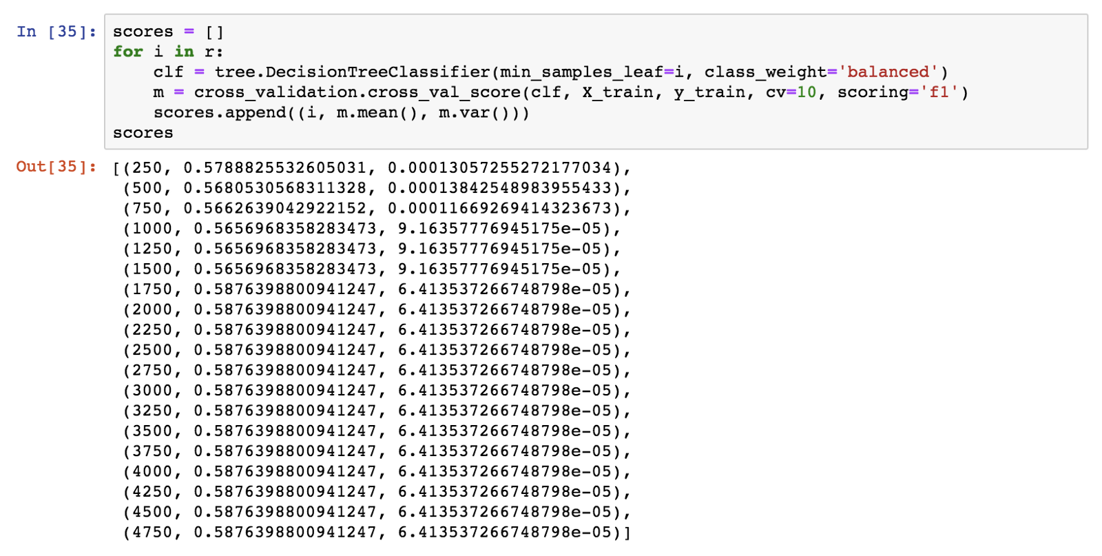 I’ll use 10-fold cross-validation in the area of 250 to 5000 minimum leaf samples value, in order to pick an exact value for use for our model. I’ll get the mean accuracy and variance of each cross-validation run.