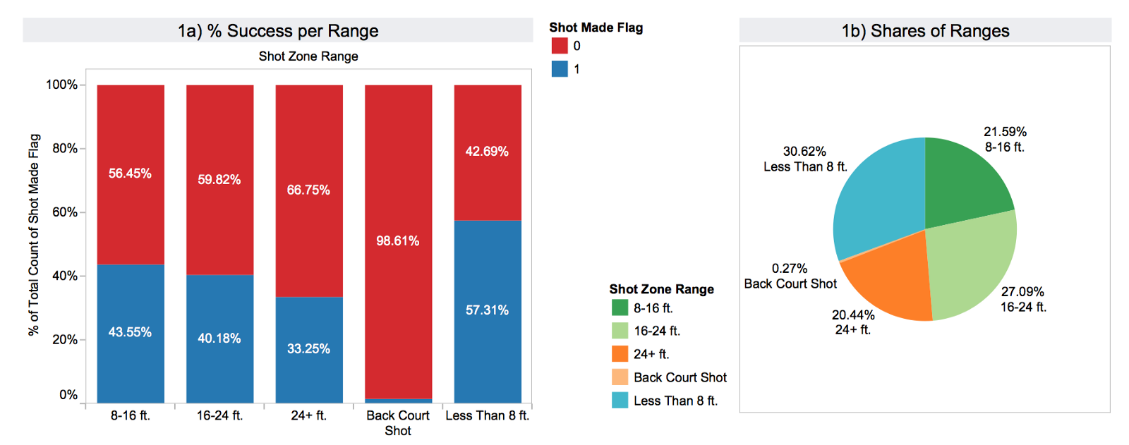 In the next graph you can see theshot_zone_range distribution. The scored shots are represented with blue and the failed attempts red. Apparently, the target variable is unevenly distributed across the subsets defined by the range feature. The pie graph on the right (1b) shows how many shots there are in each bucket in total.