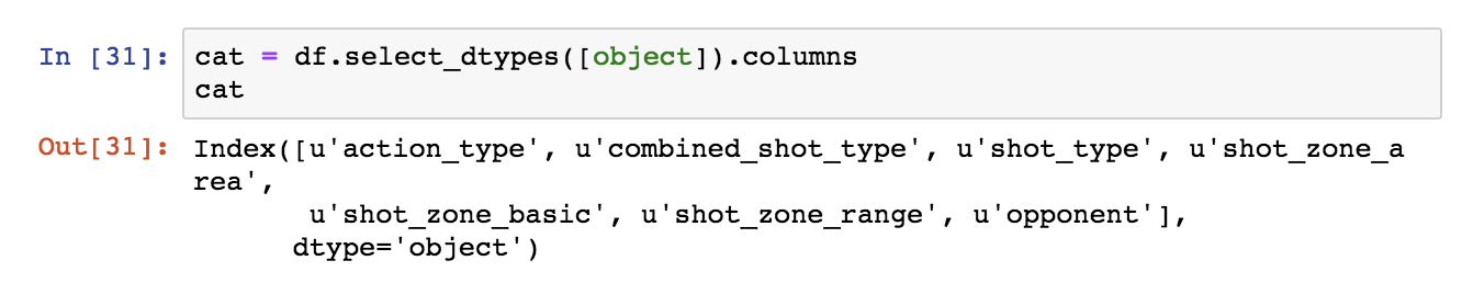 Let’s see how the Pandas method works. I will first get the list of all categorical columns (they are of type object). This can be done with select_dtypes().