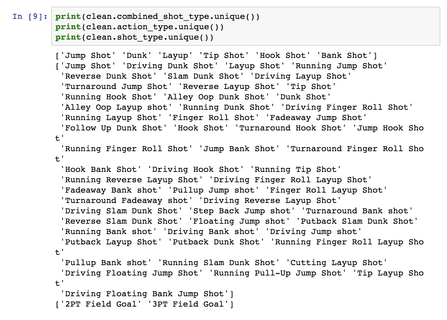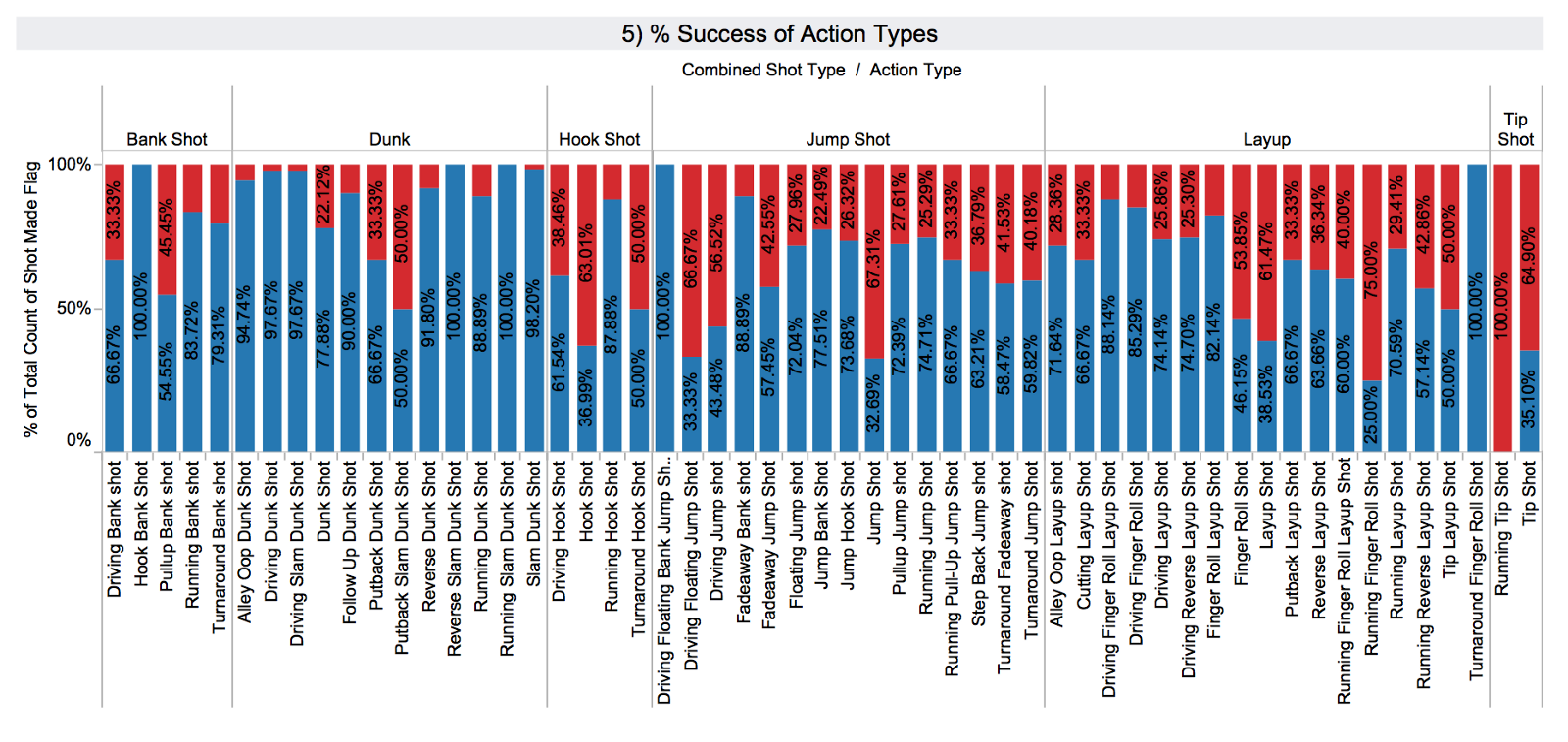 In 5) one can observe that action_type is a more fine grained categorisation of the combined_shot_type. Again there is notable variability, and so I expect that action_type is a good candidate for the predictive model.