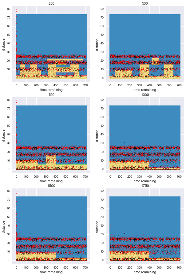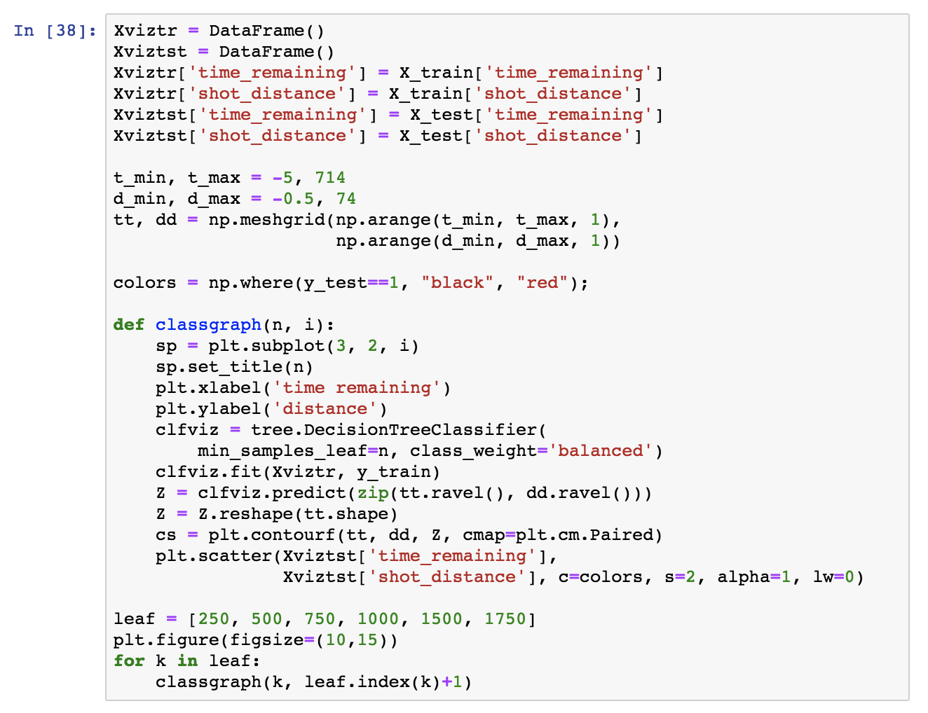 It is interesting to see how the tree divides the feature space. A typical visualisation is pairwise feature comparison. In this case, we have many categorical and binary features and that does not help visualising, so I am just picking two significant numerical features, time_remaining and shot_distance and comparing how the model complexity affects the areas that the tree creates.