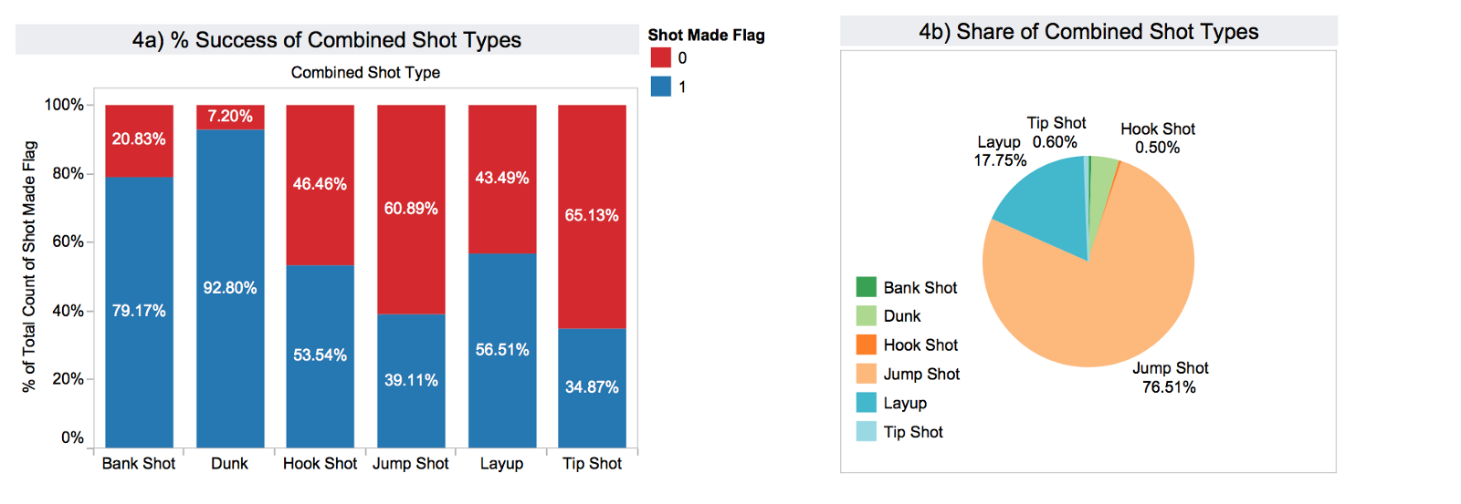In the second graph, the blue line represents scored shots per shot_distnace. The distance is in feet and one can see the steep increase at the limit of 22–23 ft. where the 3 pointer line lies. The red line shows the number of failed shots. 3a) shows the success ratio for the 2 and 3 pointers. Finally, 3b) is the share of total 2 and 3 pointers attempted (shot_type).