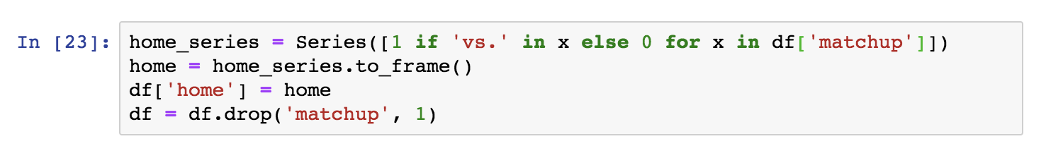 Part of the matchup information is in opponent. However, we want to capture the home/away property. We will create a series with 1s where there is ‘vs.’ in the field (apparently corresponding to home games) and 0s elsewhere (‘@’ apparently corresponding to away games). I will then drop the matchupand append the binary series: